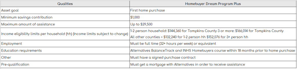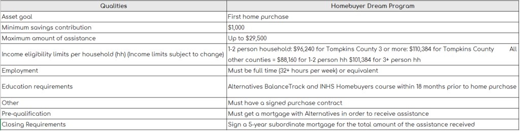 The Homebuyer Dream Program is a down-payment assistance program offered to help low to moderate income first time home buyers in Tompkins, Tioga, Chemung, Steuben, Schuyler, Seneca, Cayuga, Cortland, Monroe, Orleans, Genesee, Livingston, Ontario, Wayne, Yates, Onondaga, and Broome.