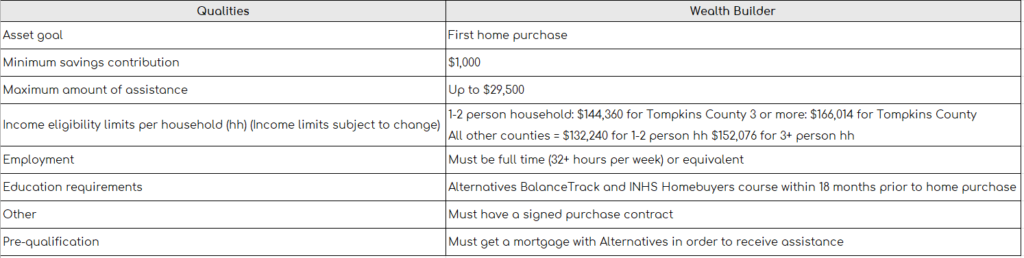The Wealth Builder program is a down-payment assistance program offered to help low-moderate income first time home buyers who are either first generational homebuyers (parents never owned a home) or are currently living in a majority minority census tract. The home being purchased must be located in Tompkins, Tioga, Chemung, Steuben, Schuyler, Seneca, Cayuga, Cortland, Monroe, Orleans, Genesee, Livingston, Ontario, Wayne, Yates, Onondaga, and Broome.